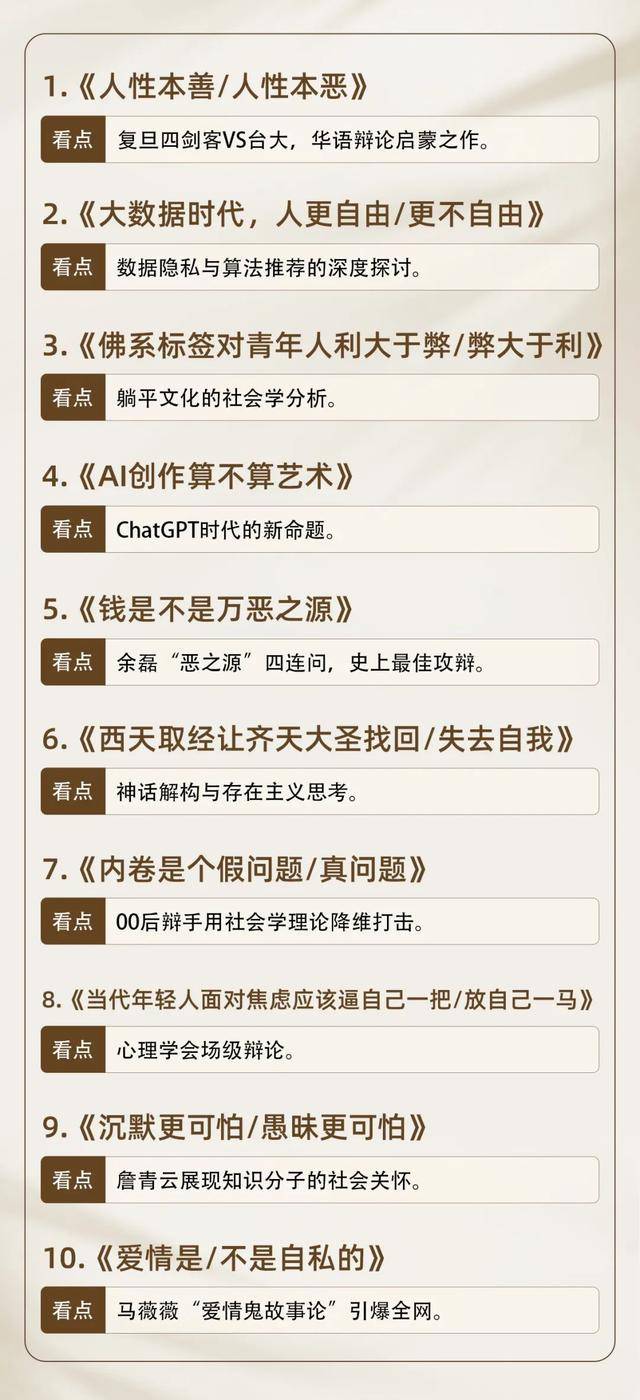 这10场辩论赛,观点犀利,精句频出,可以说是辩论赛中的神仙打架赛场。
